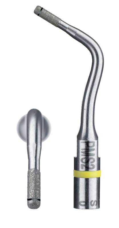 Насадка для скайлера PM2, с алмазным покрытием, для препарирования уступа. Прямой плоский кончик. Первичное препарирование осуществляется с помощью вращающихся инструментов до линии эмалево-дентинного соединения. Далее используется насадка c алмазной крошкой PM1 (выпукло-закруглённая) или насадка PMS 1 с закруглённым внутренним углом для смещения линии обработки в апикальном направлении, затем PM2 или PMS2 – насадка с мелкой алмазной крошкой, в зависимости от выбранного контура препарирования, для препарирования и полировки дентина. Она также имеет лазерную маркировку, находящуюся на расстоянии 1 мм от края её активной части. Ультразвуковыми насадками заглаживаются бороздки от алмазных боров и уступ погружается под десну. Эти насадки имеют значительное преимущество при формировании текстуры поверхности дентина по сравнению с бором и используются для ультразвуковой финишной обработки.