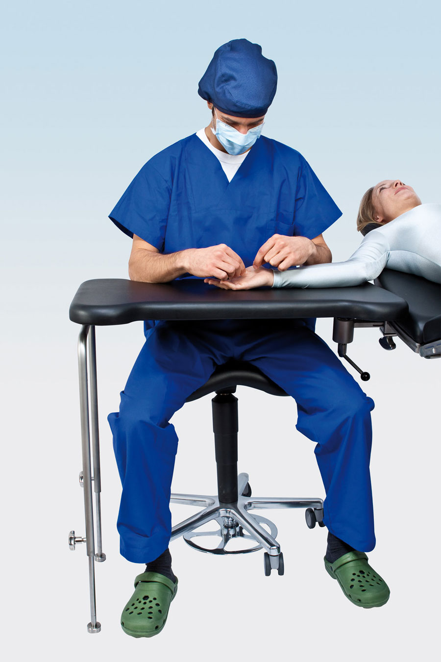 Гарантирует работу с пациентами без напряжения. Фиксация в трех точках обеспечивает дополнительную устойчивость, имеется специальный поршень для закрепления положения, размер стола позволяет создать удобное рабочее положение для хирурга и ассистентов.