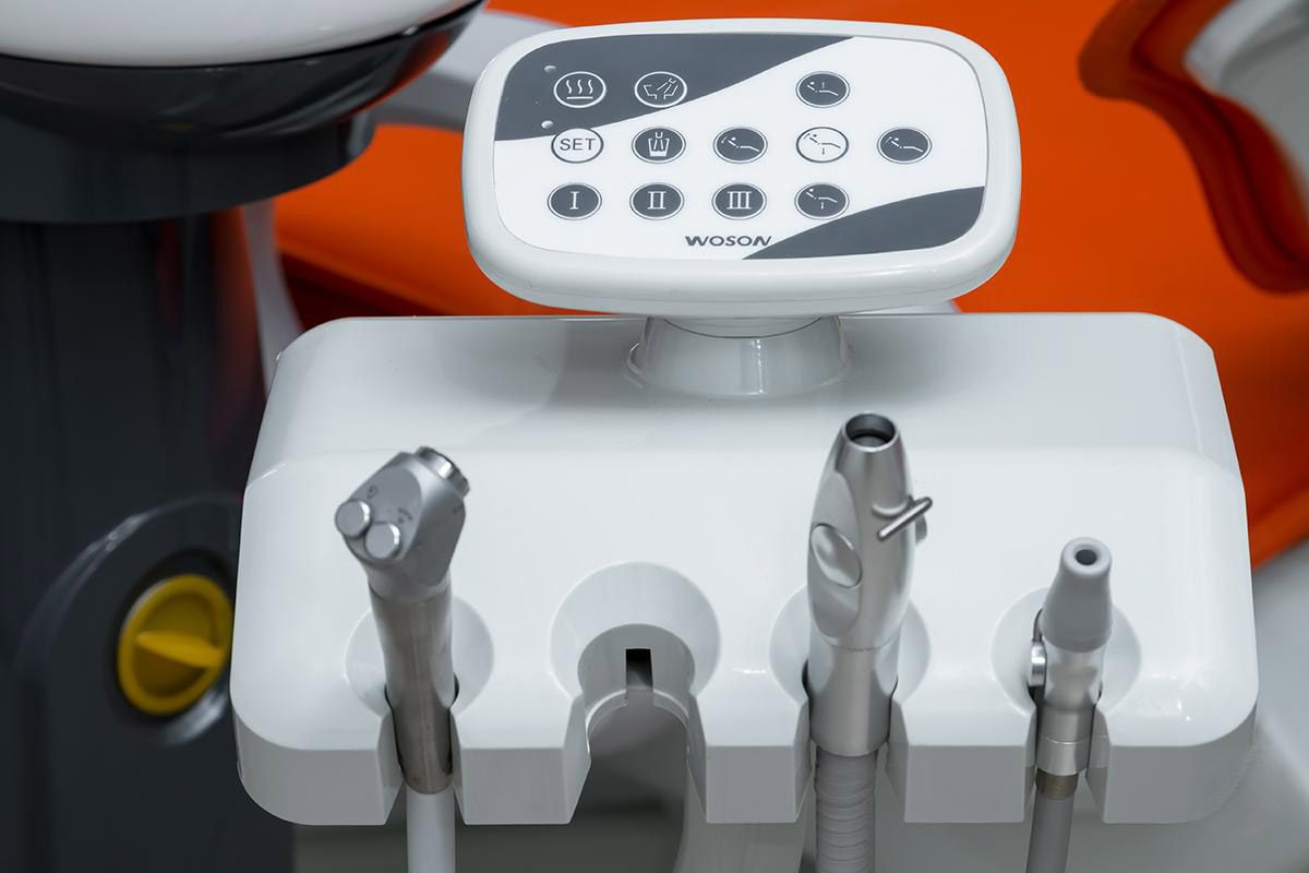 - Модуль ассистента трёхшарнирный, на четыре инструмента, с пылесосом, слюноотсосом и пистолетом вода-воздух, с панелью управления креслом и гидроблоком.