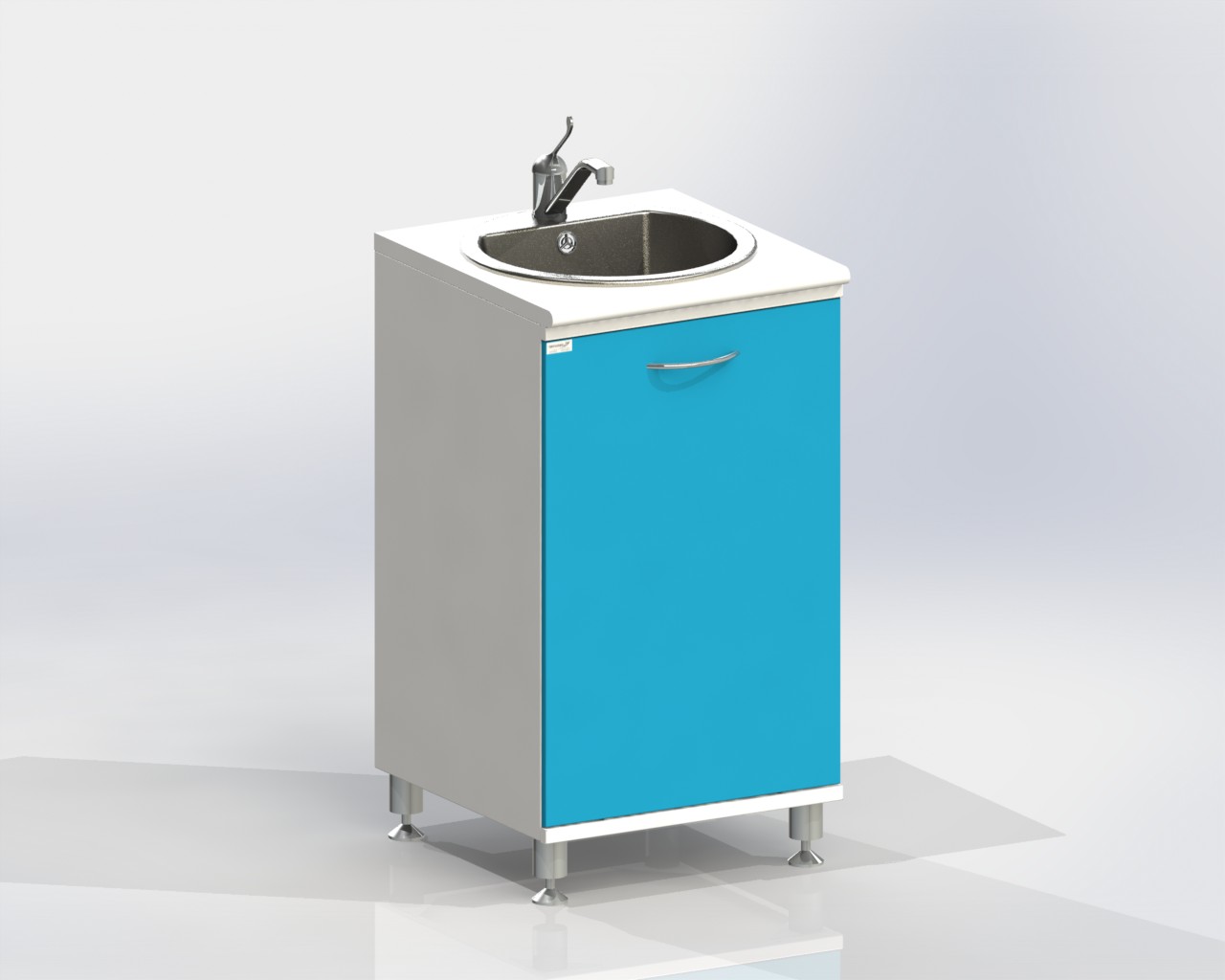 Тумба с дверцей, с вырезом в задней стенке для подвода коммуникаций, оснащена мойкой из нержавеющей стали, локтевым смесителем, сифоном.
