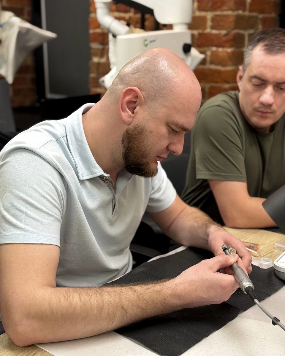 После насыщенной теории, они на практике отработали моделирование шаблона, коронки и абатмента, а также провели установку имплантатов через шаблон с немедленной нагрузкой.